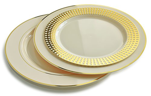 " OCCASIONS " 120 PACK, Medium Weight Disposable Wedding Party Plastic Plates (Dinner Plate, Princess Ivory and Gold)