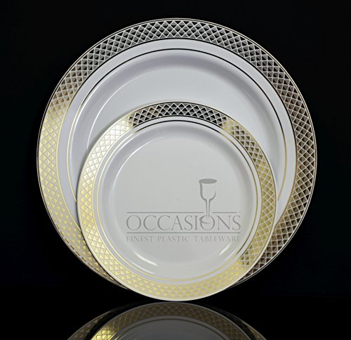 " OCCASIONS " 120 PACK, Heavyweight Disposable Wedding Party Plastic Plates (7.5'' Salad / Dessert Plate, White / Gold Rim)