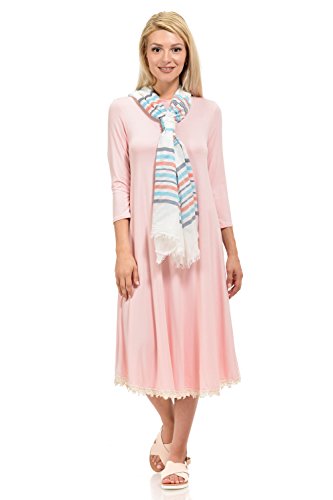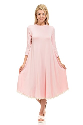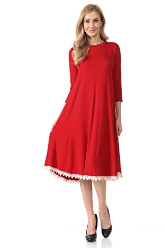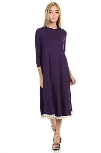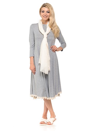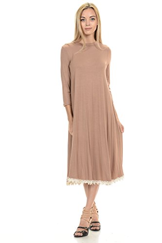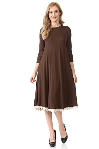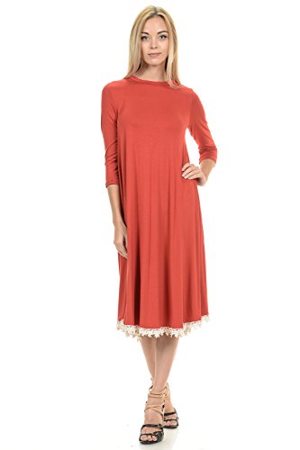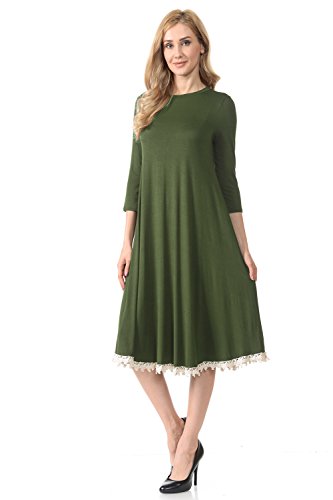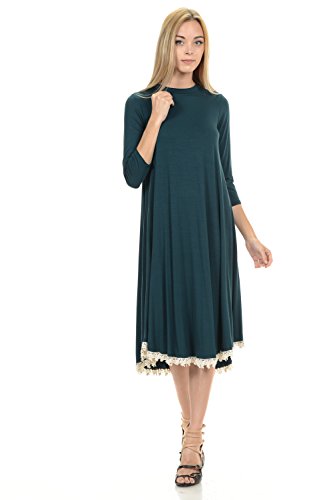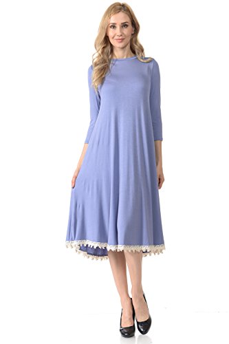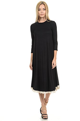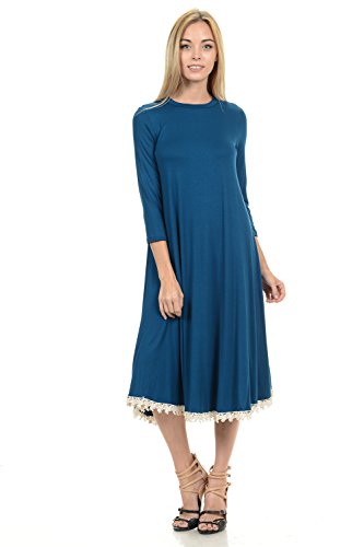 This dress features 3/4 sleeves, crew neckline, midi lenght and crochet lace trim at the bottom. It is made with a soft jersey knit that will create a beautigul drape.