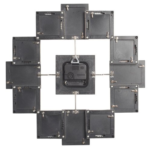 A square clock sits in the centre of this design, held in position by 4 steel rods to the surrounding photo frame collage.