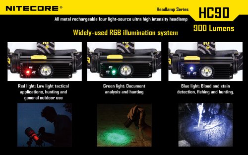 -. Feature : Maximium 900 Lumens white light output with red green and blue color lights / Robust built and easy to use slide switch to continuous adjust brightness and colors / Built-in USB charger that allow you to recharge the headlamp / Use 1x 18650 Rechargeable battery or 2x CR123A battery (1x Nitecore 2300mAh 18650 included)) / Bundle includes Nitecore HC90 Headlamp, head straps, USB charging cable, 2300mAh Nitecore 18650, and a bright Lumentac key chain light