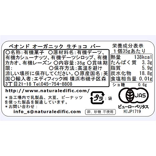 原材料:有機デーツ、有機カシューナッツ、有機アガベシロップ、有機カカオ、有機レーズン