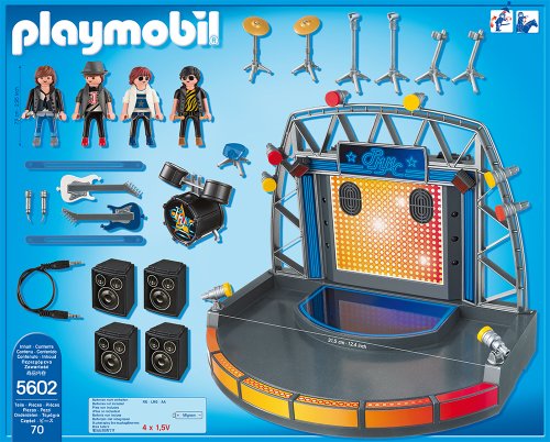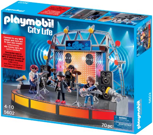 -. Feature : Wow crowds and belt out your favorite tune with the Playmobil Pop Stars Stage / Just plug in your MP3-player and hear your music play on the built-in speakers / Playmobil is the largest toy manufacturer in Germany / Figures can bend, sit, stand and turn their heads / Includes 4 figures, stage with flashing lights, drum set, 2 guitars with stands, microphones, 2 preloaded tunes, built-in speakers and accessories