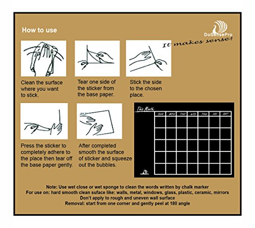 -. Feature : BE EFFECTIVE and ORGANIZE with a Decorative Monthly Chalkboard Calendar Sticker. Easily Take Care of Your Schedule and the To Do List. / EASY TO USE with DoSensePro Chalk Markers. Add Your Own Touch to the Kitchen, Child room, Office, Restaurant and Dorm Rooms' Decorations. / EASY TO WRITE AND EASY TO WIPE, Eco-Friendly Design. It's Reusable and Recyclable and Updates Quickly. / BONUS! The Monthly Planner Vinyl Sticker arrives with 4 Fine Tip Markers. / 100% Guarantee! If you are not completely satisfied, contact us immediately to rectify the issue.