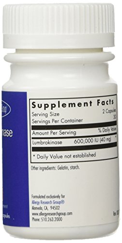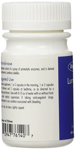 Lumbrokinase 60 caps Dietary Supplement Supplement Facts Serving Size: 2 capsules Servings per Container: 30 Amount per Serving: Lumbrokinase 600,000 IU (40 mg) Other Ingredients: Gelatin, starch Suggested Use: As a dietary supplement, take 1 or 2 capsules in the morning, 1 or 2 capsules in the afternoon and 2 capsules at bedtime, or as directed by a healthcare practitioner. Take with 8-10 oz of water with or without food. Use under medical supervision if taking anticoagulant drugs. Contraindicated in any condition associated with bleeding. Lumbrokinase Isolated and purified enzyme derived from Lumbricus rubellus. Research shows Lumbrokinase to support the body in breaking up and dissolving unhealthy blood coagulation and to enhance fibrinolytic activity. * *These statements have not been evaluated by the Food and Drug Administration. This product is not intended to diagnose, treat, cure, or prevent any disease.