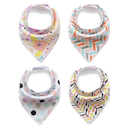 -. Feature : SUPER ABSORBENT DROOL & REFLUX BIBS - These stylish drool bibs are made of 100% absorbent cotton on the front and 100% polyester fleece on the back. The front of the baby bib is a stylish knit fabric and the back is a super soft fleece that keeps your baby completely dry even with the drooliest of babies. Great for teething babies! / ADJUSTABLE NICKEL-FREE SNAPS - 2 nickel-free snaps provide different sizing as baby grows. Recommended ages: 3 to 24 months. Bibs stay in place and your baby won't be able to pull them off! / TRENDY AND STYLISH BABY FASHION ACCESSORY - Our bandana bibs feature our own custom and unique designs that are trendy and fashion-forward. They're versatile and are the perfect finishing touch for any outfit. / UNIQUE BABY GIFT SET - Our 4-pack of baby bibs makes the best gift for new parents, new grandparents, baby showers, or for any excuse to make a baby look amazing. / AWESOME CUSTOMER SERVICE - We guarantee you will love the our bandana drool bibs, and if you aren't absolutely satisfied, return it within 30 days for a full refund, no questions asked.