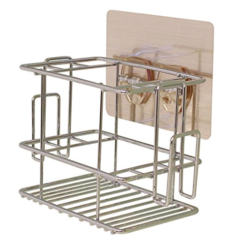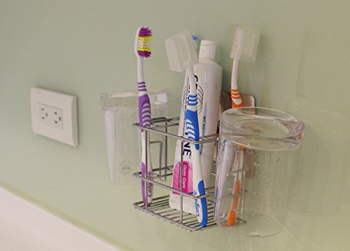 - Adhesive-mounted toothbrush holder caddy on wall/mirror for your toothbrush, toothpaste, razor etc. & 2 mugs. Declutter/organize your sink space. Let your toiletries air-dry quicker with this metal wire design.