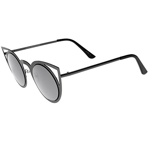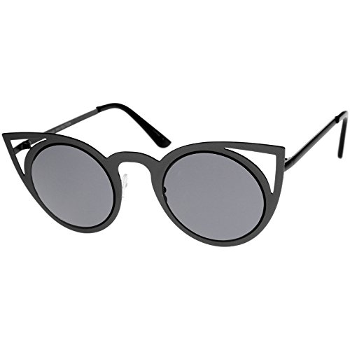 zeroUV - Womens Fashion Round Metal Cut-Out Flash Mirror Lens Cat Eye Sunglasses (Black / Smoke)