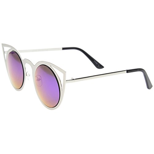 zeroUV - Womens Fashion Round Metal Cut-Out Flash Mirror Lens Cat Eye Sunglasses (Silver / Lavender)