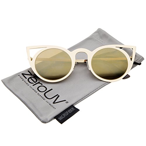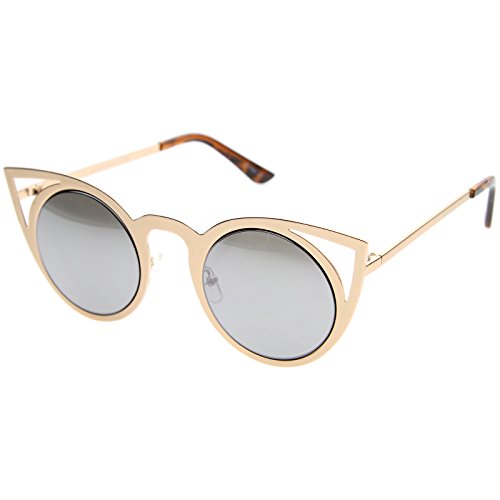 zeroUV - Womens Fashion Round Metal Cut-Out Flash Mirror Lens Cat Eye Sunglasses (Gold / Silver Mirror)