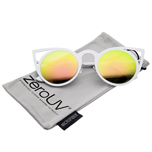 zeroUV - Womens Fashion Round Metal Cut-Out Flash Mirror Lens Cat Eye Sunglasses (White / Pink Green Mirror)