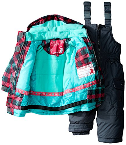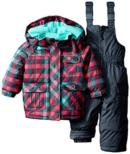 Two piece snowsuit set. All over plaid printed ski jacket and solid contrast color snow bib.