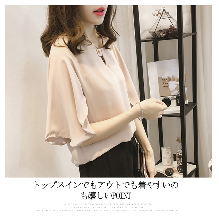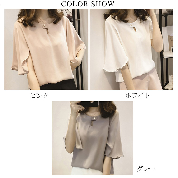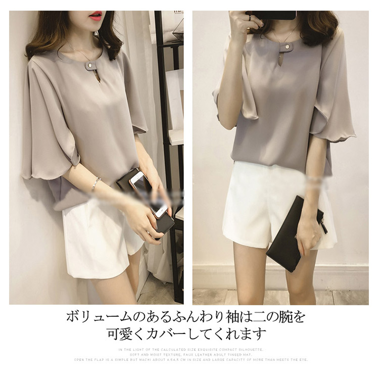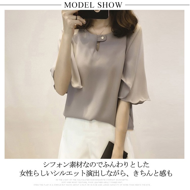 | 全3カラー!フレア袖デザインがフェミニンなシフォンブラウスの登場シフォン素材なのでふんわりとした女性らしいシルエット演出しながら、きちんと感もボリュームのあるふんわり袖は二の腕を可愛くカバーしてくれますトップスインでもアウトでも着やすいのも嬉しいPOINTシンプルなデザインなのでボトムを選ばずデイリースタイルにはもちろん、お出かけにも対応OKなITEmです | |