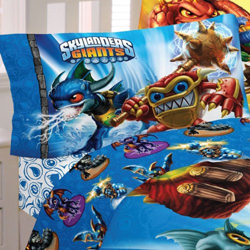 Take your son on an adventure with Spyros and his Skylander Friends. The full fitted sheet is on a white ground with blue images, the flat sheet is on a blue ground and features Skylander characters and 2 pillowcases that reverse for two different looks. Made of soft 100-percent polyester microfiber.Feature