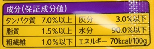 素材構成:タンパク質:7.0%以上、脂質:1.5%以上、粗繊維:1.0%以下、灰分:3.0%以下、水分:90.0%以下、エネルギー:70kcal