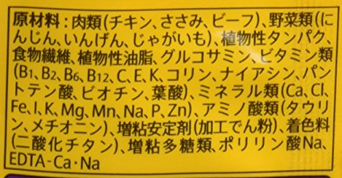 原材料:肉類(チキン、ささみ、ビーフ)、野菜類(にんじん、いんげん、じゃがいも)、植物性タンパク、食物繊維、植物性油脂、グルコサミン、ビタミン類(B1,B2,B6,B12,C,E,K、コリン、ナイアシン、パントテン酸、ビオチン、葉酸)、ミネラル類(Ca、Cl、Fe、I、K、Mg、Mn、Na、P、Zn)、アミノ酸類(タウリン、メチオニン)、増粘安定剤(加工でん粉)、着色料(二酸化チタン)、増粘多糖類、ポリリン酸Na、EDTA‐Ca・Na