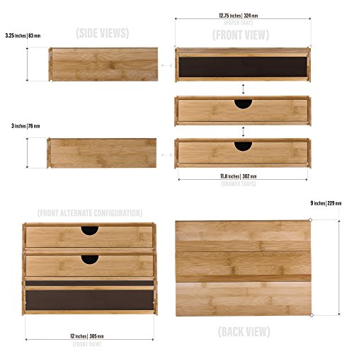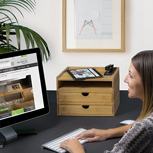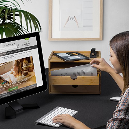 ELIMINATE DESK CLUTTER: An attractive and functional 3-tier desk organizer made of natural bamboo that is small enough to fit in the corner of your desk or countertop, yet large enough to hold 8.5 x 11” paper and other items that clutter up your workspace