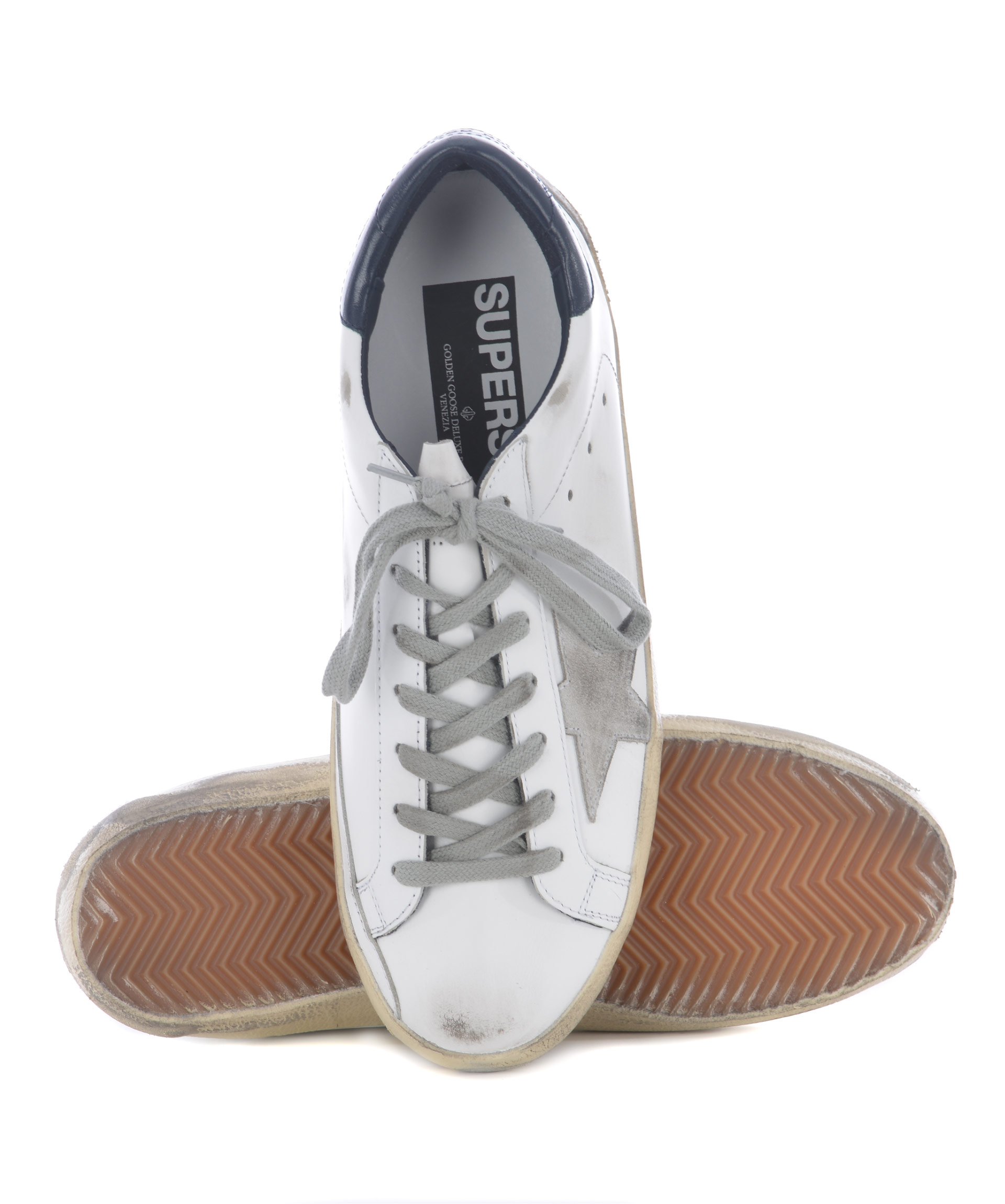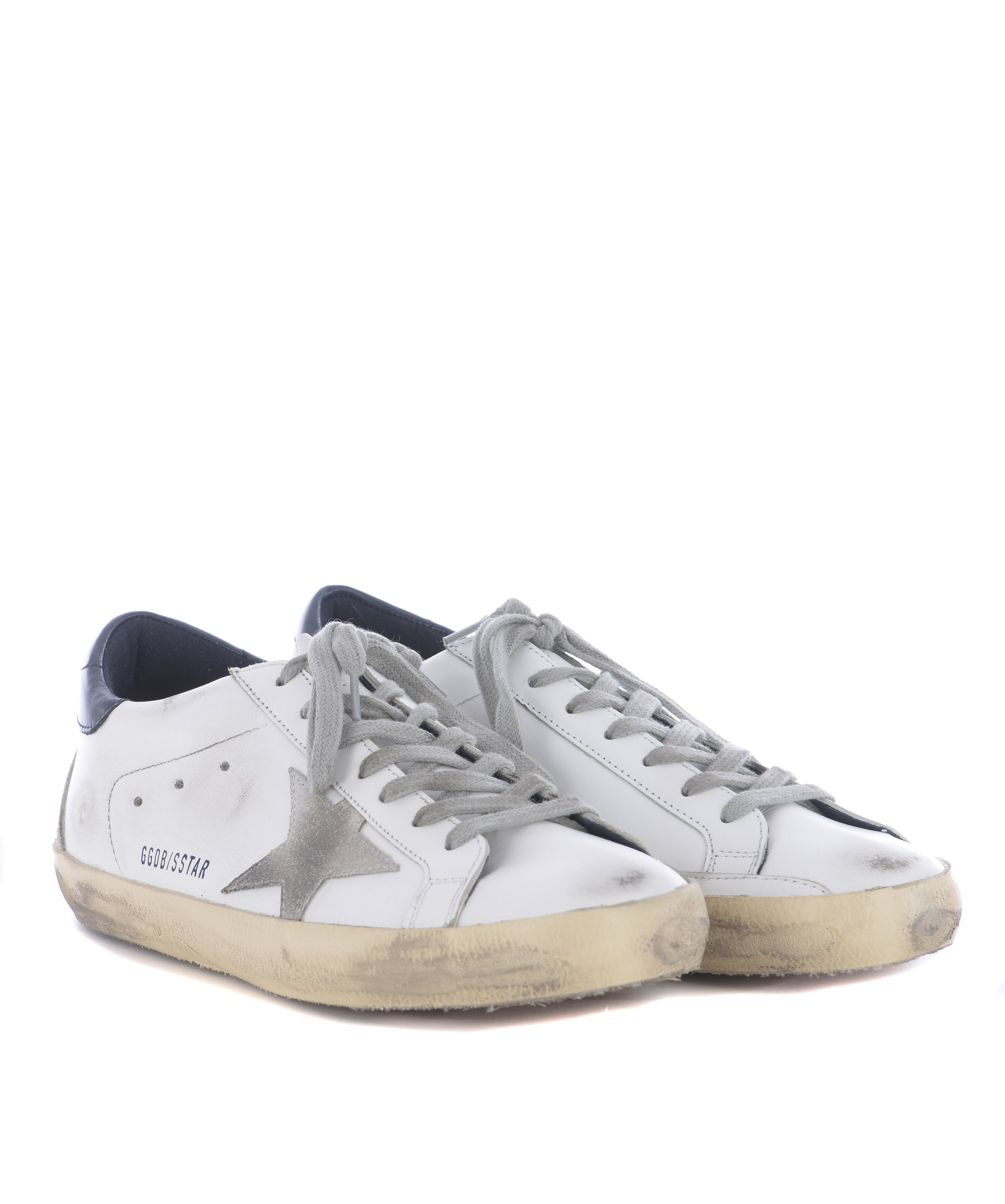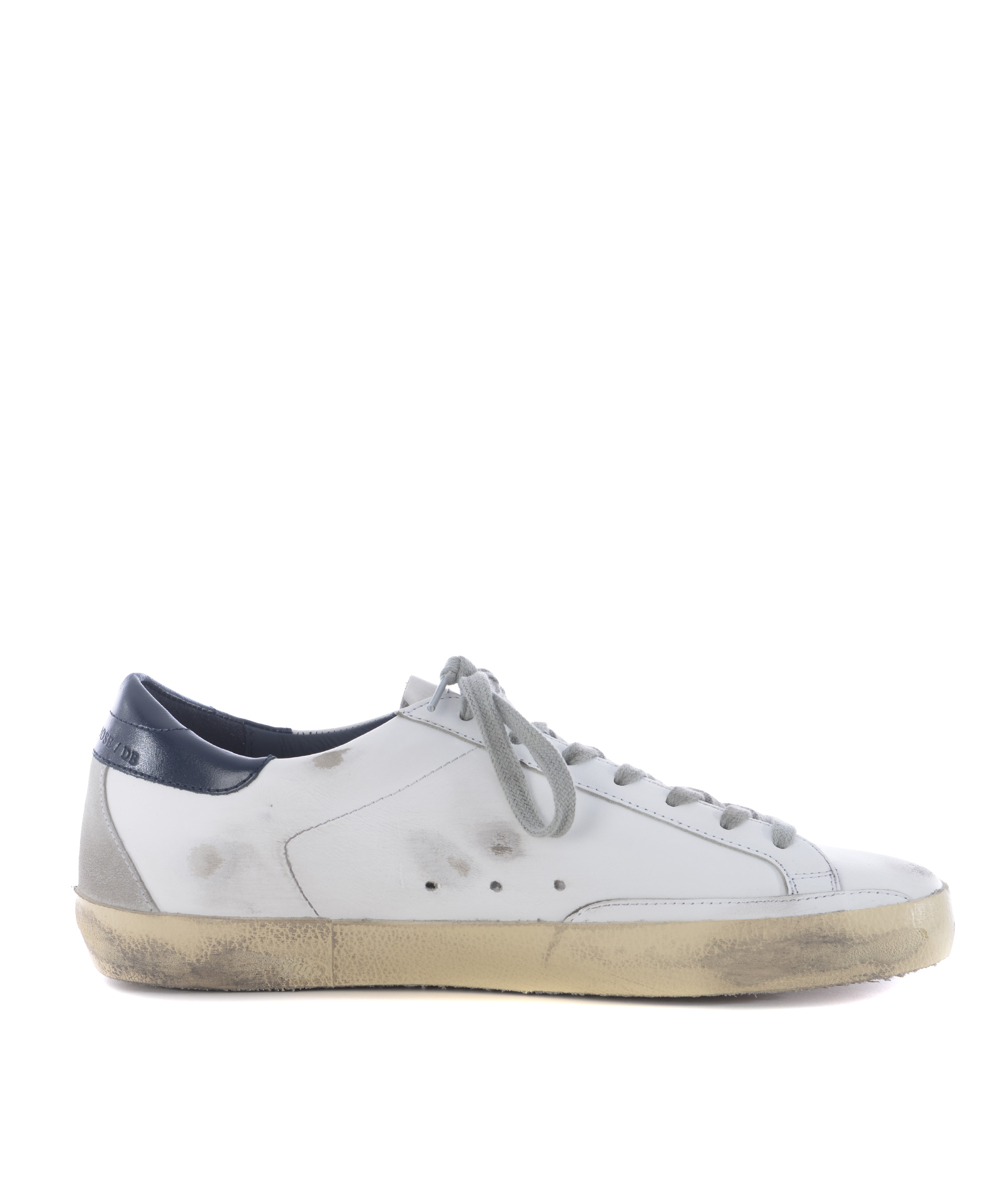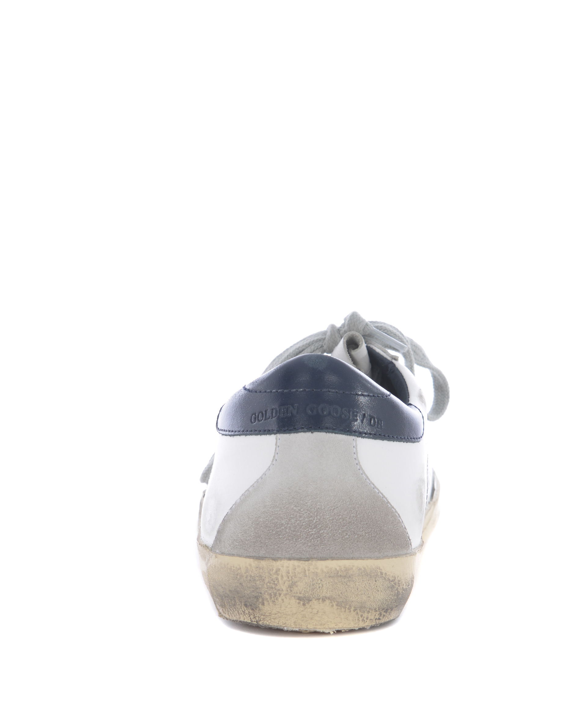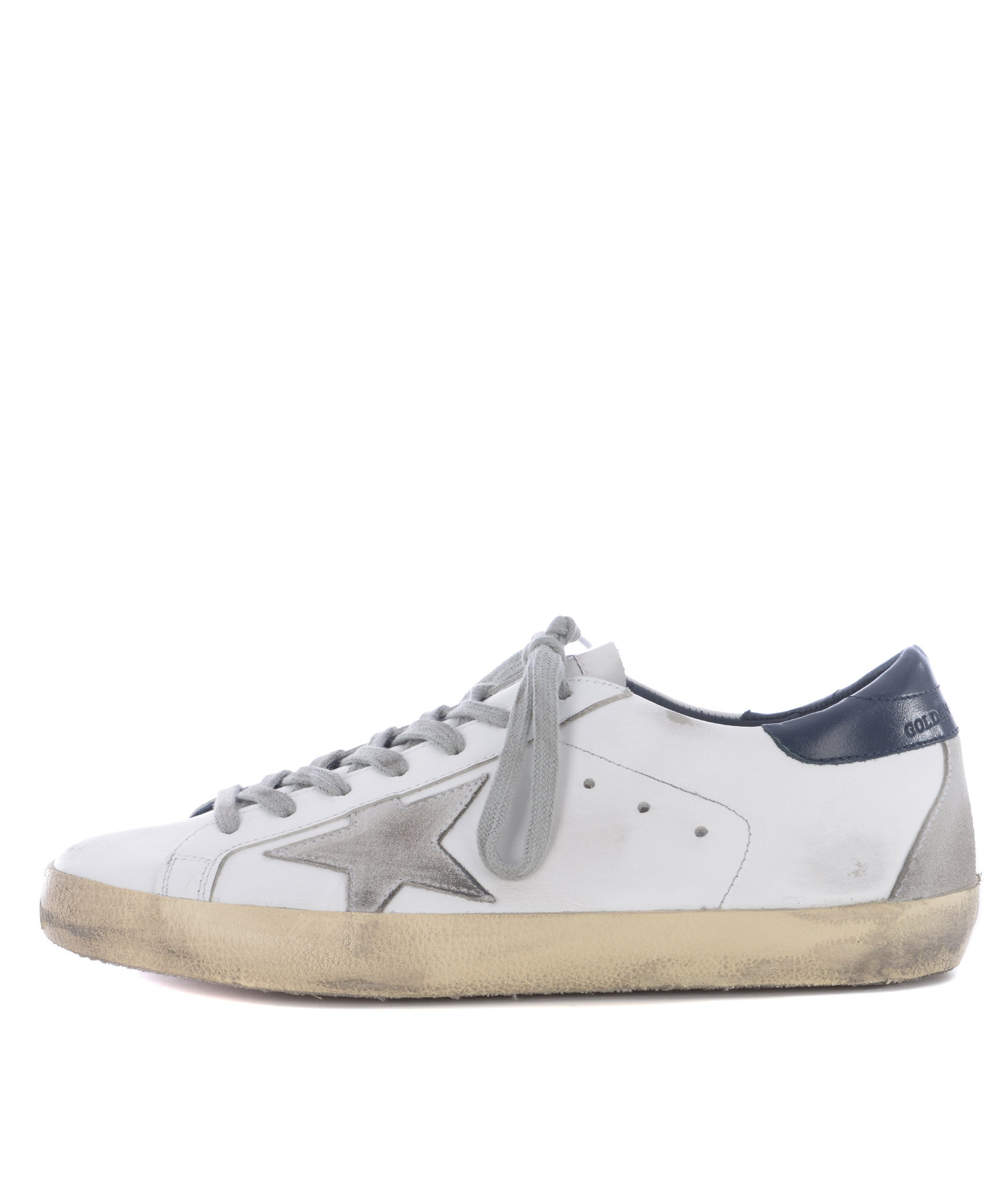 Superstar Sneakers from Golden Goose: White/Blue Superstar Sneakers with round toe, lace-up front fastening, star patch at side, logo patch at tongue, perforated detail and flat rubber sole.