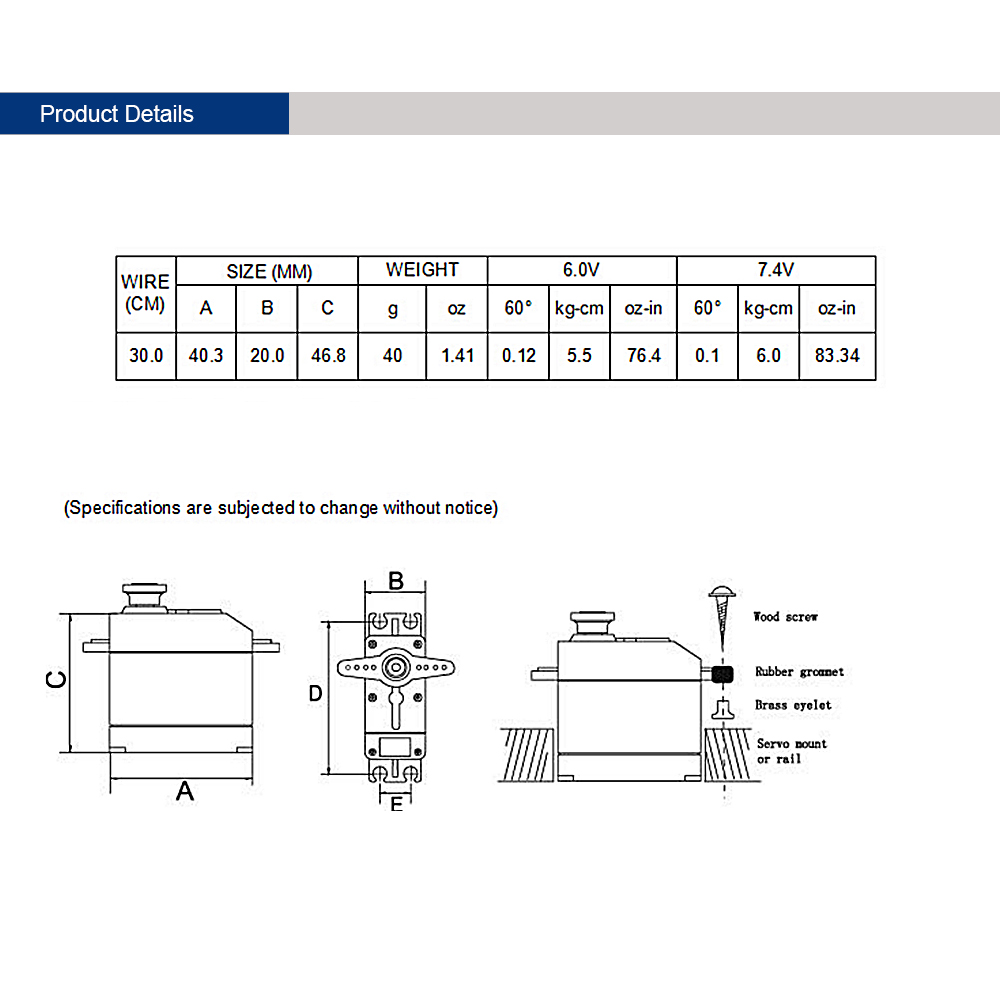 Stall torque: 5.5kg.cm @ 6.0V; 6kg.cm @ 7.4V