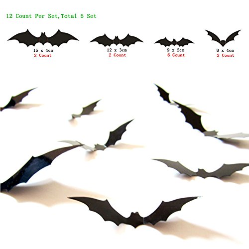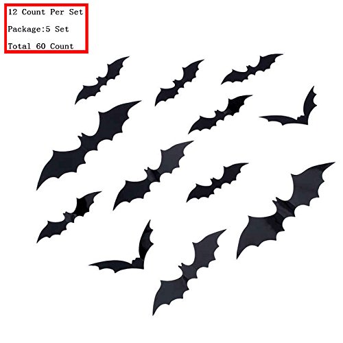 AKOAK 60 Count 4 Size Assorted 3D PVC Black Bat Decoration Halloween Party Supplies Home Decor Wall Sticker Curtain Window Decor Decals