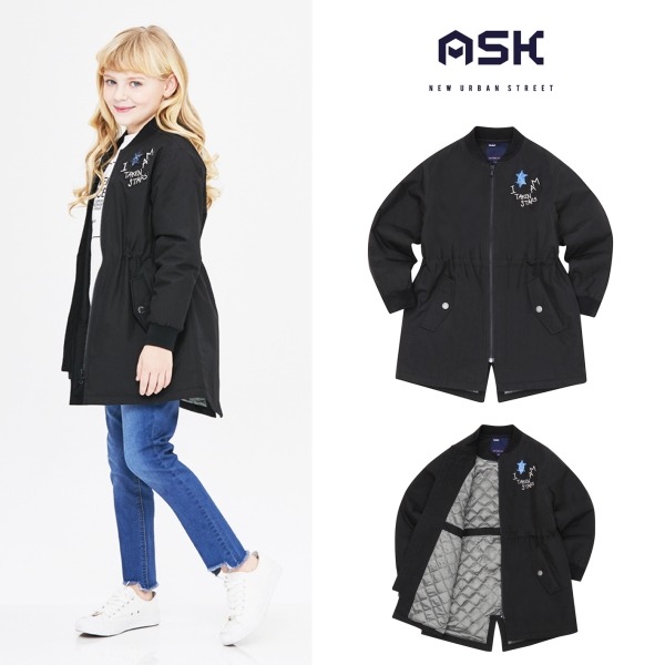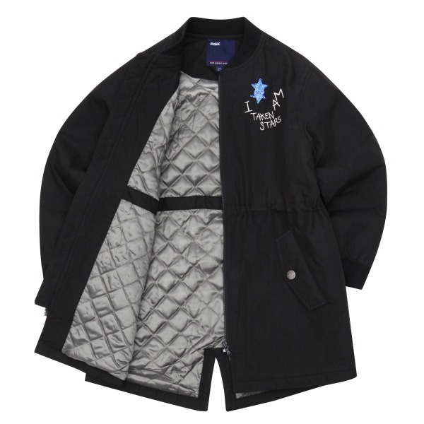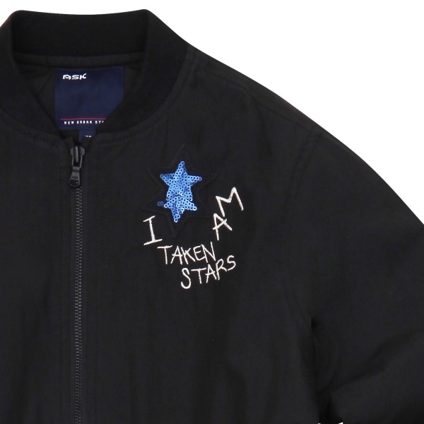 가슴에 별와펜을 포인트로 안감또한 누빔으로 허리조절끈이 장착되어있어품조절이나 라인조절이 가능한 봄가을용 블랙 항공점퍼