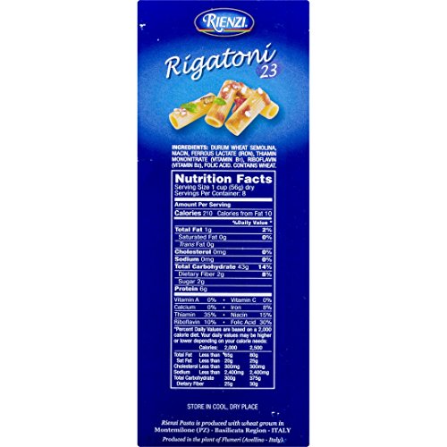 -. Feature : Rienzi imported italian pasta, #23 rigatoni, 16 ounce box / Rienzi pasta is produced with wheat grown in the montemilone (pz) basilicata region, italy / Product in the plant of casteldaccia in palermo, italy (sicily) / Cooks in just 8 minutes / Ingredients: 100% Enriched semolina (thiamine, riboflavin, niacin, folic acid)