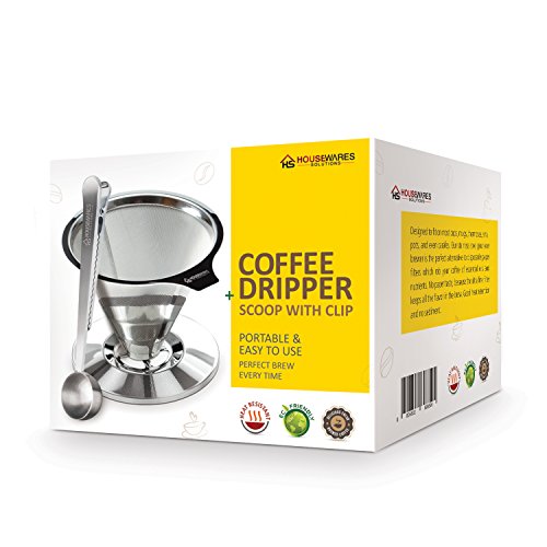 -. Feature : PRECISION LASER-CUT FILTER + BONUS COFFEE SCOOP WITH BUILT IN BAG CLIP - Makes 1 - 4 cups of coffee. No more grounds ending up in your cup with our reusable double mesh coffee filter. Unlike disposable paper filters which rob your coffee of essential oils and nutrients, this is made of BPA free 18/8 (304) stainless steel, which allows the coffee oils to flow through for a richer, better tasting coffee. Includes a free coffee scoop with built-in bag clip, adding more value to your purchase. / EASY TO USE AND CLEAN - Brewing fresh coffee with our pour over coffee maker could not be easier. Never buy or discard another coffee filter again. The built in stand is designed to fit on most cups, mugs, thermoses, small pots, and even carafes. This brewing method is as quick and easy as automatic brewing machines and can easily be cleaned. Just place it in your dishwasher or rinse well with hot water after brewing. / REUSABLE AND ECO FRIENDLY - Our coffee dripper provides a cost effective way to brew your favorite coffee while saving the environment. Reduce the number of prefilled cups thrown into the garbage. No need to buy paper filters that create waste and reduce the taste of your coffee by absorbing all the essential oils and nutrients. / PORTABLE, LIGHT WEIGHT AND GREAT FOR GROUP CAMPING - It is easy to pack and carry which makes it ideal for camping. It is also light weight, very sturdy and fits well over small camp pots. This pour over coffee dripper can be used for one or more persons. Housewares Solutions pour over coffee dripper is an excellent choice if you are looking for a fast, easy, inexpensive, yet tasty way to brew coffee on your upcoming weeklong camping vacation. / 100% LIFETIME MONEY BACK GUARANTEE - Features Medical/100% Food-Grade (BPA free/lead free) construction, and excellent water dispersion system. The flat bottom makes it easy to fill with fresh ground coffee or your favorite coffee. You'll save the most and limit trash with our stainless steel pour over coffee dripper. However, if you are not happy with it, feel free to return it and get your money back.