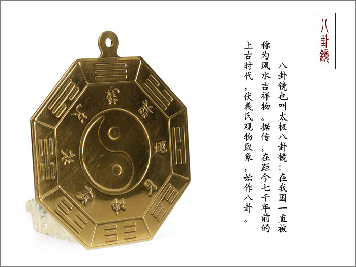 Also known as Tai Chi Bagua Bagua Mirror Mirror : The country has been known as feng shui mascot. According to legend, in ancient times dating back seven thousand years ago , Fuxi watching for images before making the gossip . . " To pass the gods of Germany, to the class of all things love" "Easy copulative Biography" , said: "Easy Tai Chi is two appearances , appearances of Health four images, four images and raw gossip ," Tai Chi is one , that is . Road , is totally strength of the elephant, is the root cause of heaven and earth . Yang Tai Chi movement was born , still born female , yin and yang are two appearances . The two appearances gave birth to a yin and yang as four images ( Shaoyang, old Yang , Shao , old yin ) . Four images is Yin and change in nature , but also on behalf of seasons seasons . The four images each born again yin and yang , it generates a gossip .