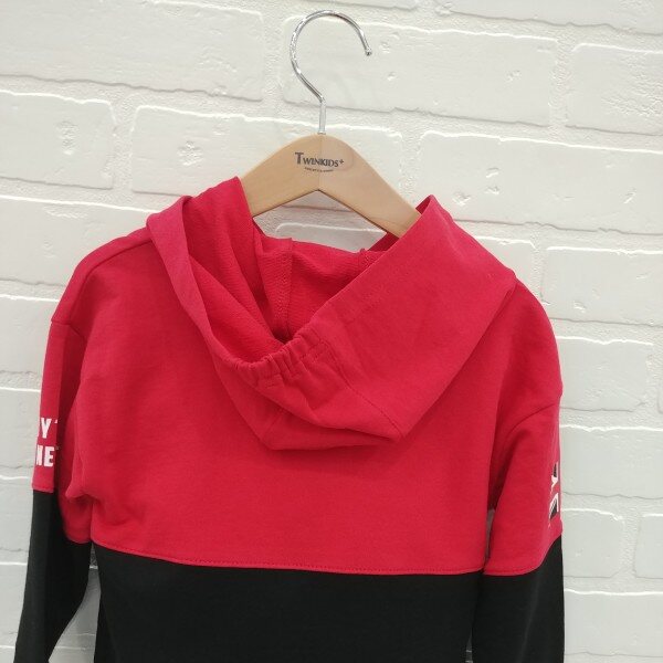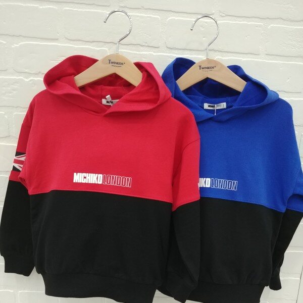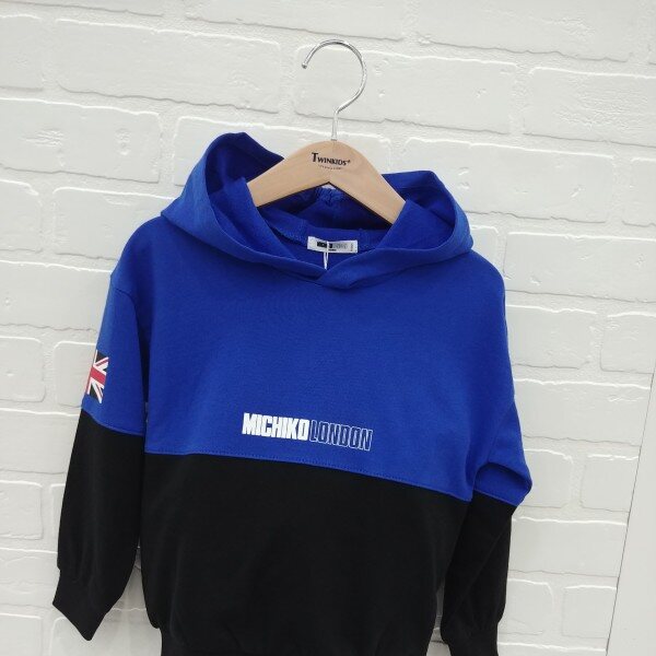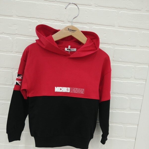 미치코런던 레터링과 국기 나염으로 포인트를준 컬러블럭 후드티셔츠