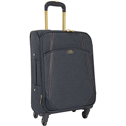 -. Feature : two-tone textured "denim" polyester body fabric / lightweight aluminum push-button locking trolley handle with a gold plated finish / four wheel spinner for easy maneuverability / Fully lined interior with organizational pockets and adjustable valet straps / 14x8x20