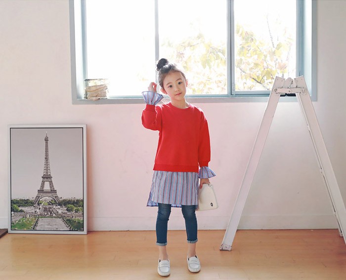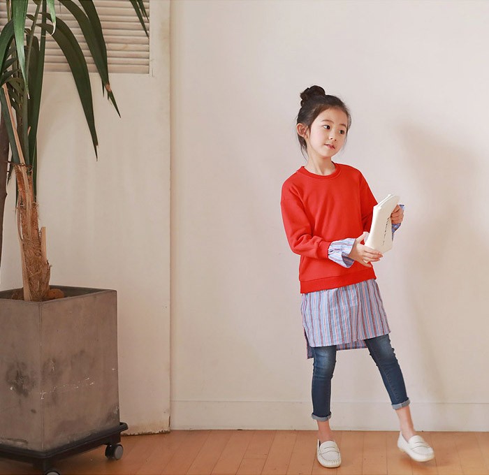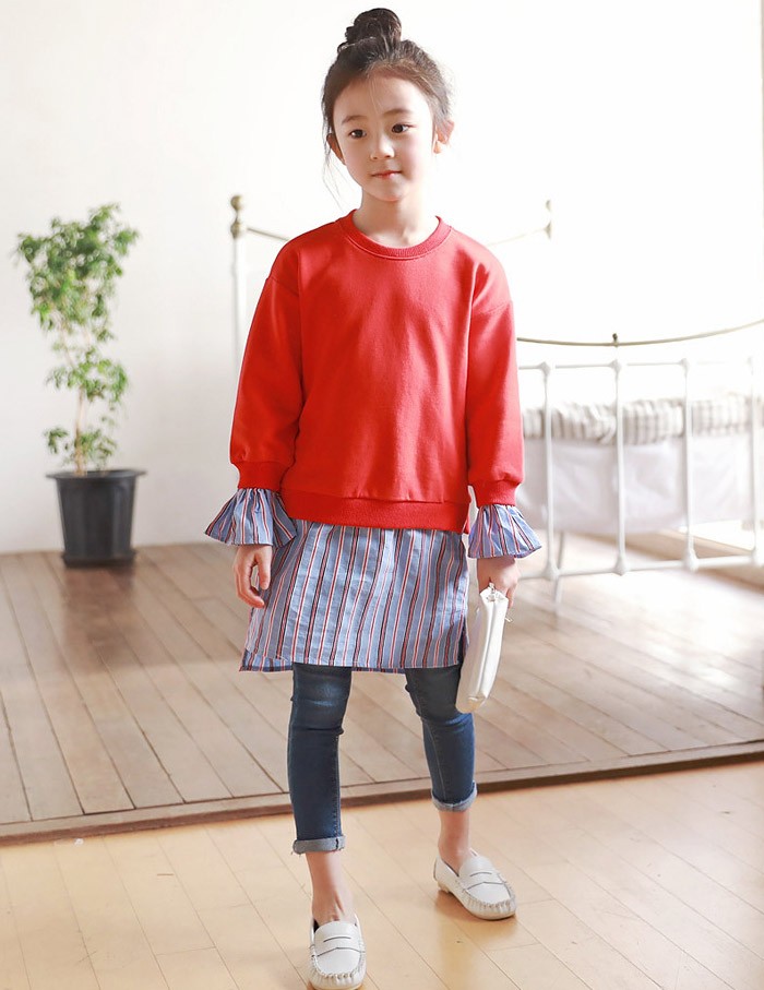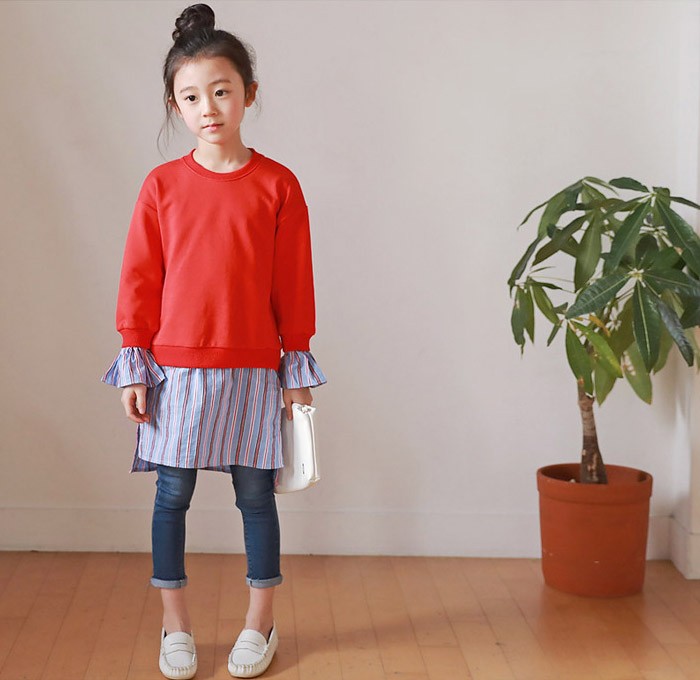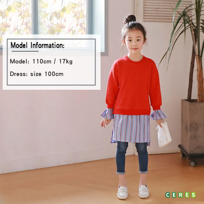【製品仕様】■商品説明・ビビットカラートップスとストライプスカートの重ね着風がオシャレ!・ママとお揃いコーデ・春らしいストライプスカート■カラー:レッド■材質:コットン95%、ポリウレタン5%■サイズ(平置き採寸) 100cm: バスト:36cm 総丈:57cm 袖口:11.5cm 袖丈:36cm 110cm: バスト:38cm 総丈:62cm 袖口:11.8cm 袖丈:40.2cm 120cm: バスト:40cm 総丈:67cm 袖口:12.1cm 袖丈:44.4cm 130cm: バスト:42cm 総丈:72cm 袖口:12.4cm 袖丈:48.6cm 140cm: バスト:44cm 総丈:77cm 袖口:12.7cm 袖丈:52.8cm 150cm: バスト:46cm 総丈:82cm 袖口:13cm 袖丈:57cm ママ/F: バスト:53cm 総丈:88cm 袖口:14cm 袖丈:63cm