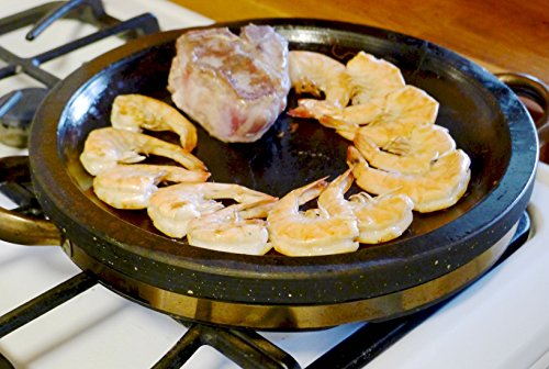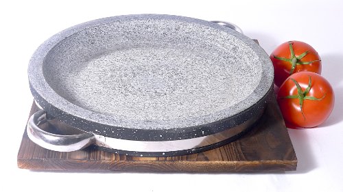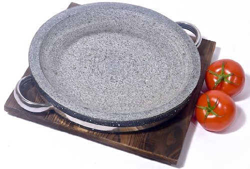 This Spiceberry Home grilling pan is made of heavyweight granite and is excellent for searing and cooking meats, fish, vegetables and more. The concept is to heat up the dish until sizzling hot. Placing it in a 400-Degree oven for about 30 minutes is a great way to start. Next, you can place it on your gas stove and grill directly. Since the food does not cool the pan, you will achieve an excellent sear with minimal sticking an low smoke. You can bring the sizzling plate to the table and place on the included rustic wood trivet. Another, more traditional alternative is to bring the preheated plate to the dining table and place on the included a Japanese style tabletop butane burner (not included but available on Amazon). Everyone can then cook their own, teppanyaki style! Since these are made of natural stone, every dish will have slight differences and character that do not affect performance.Feature