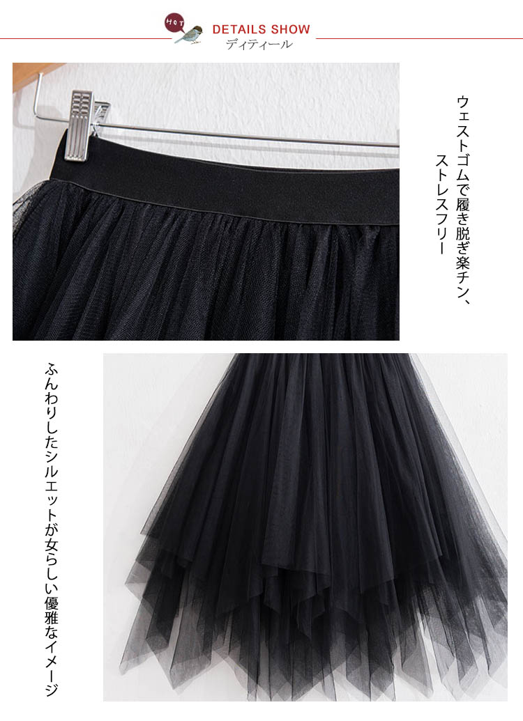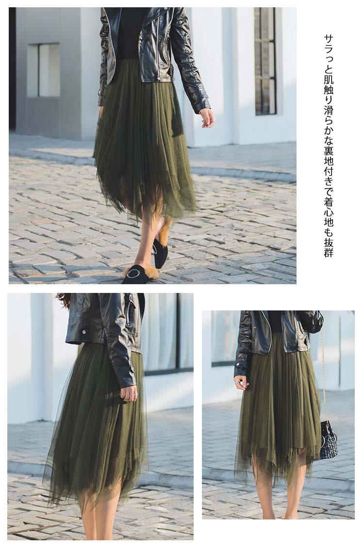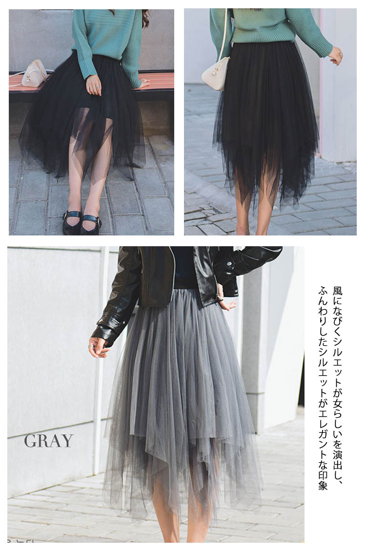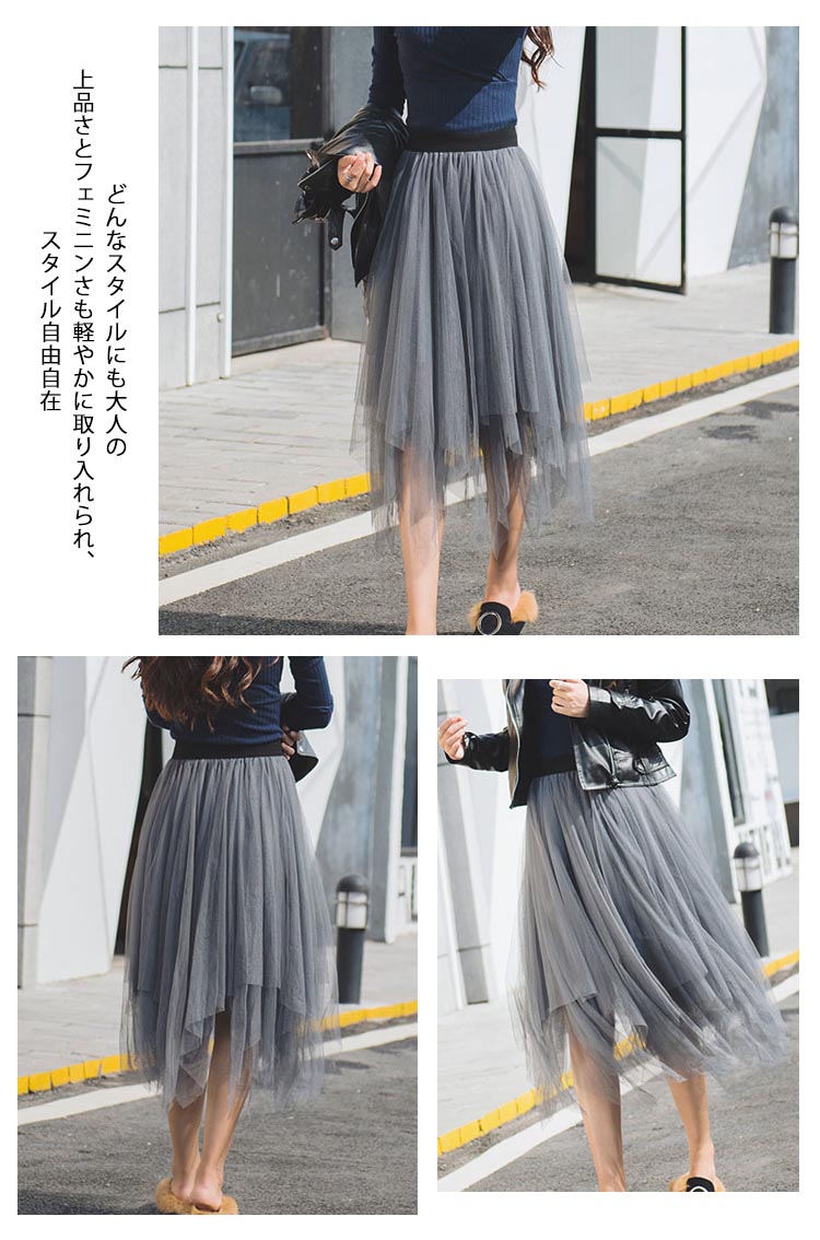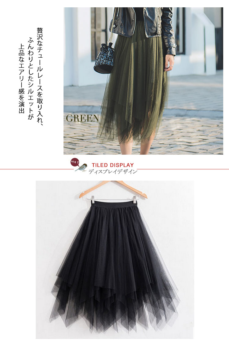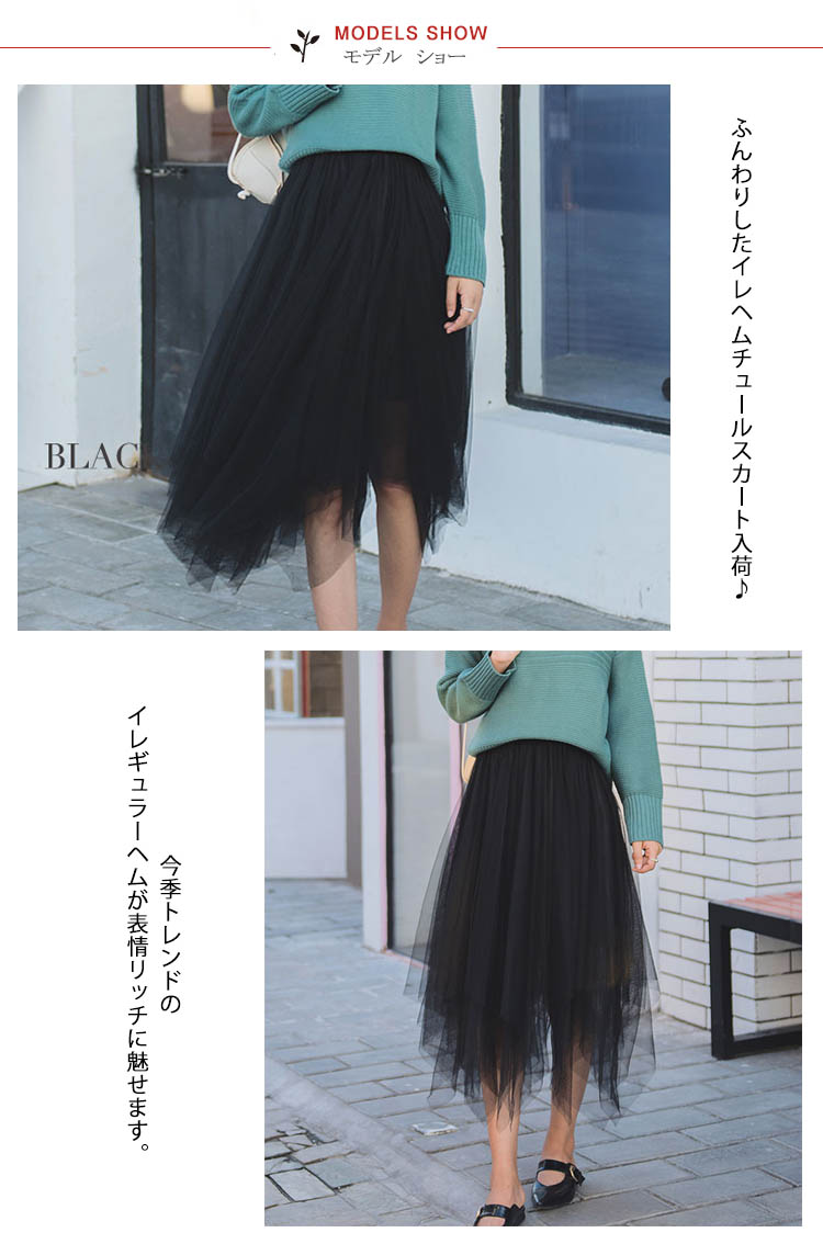 | ふんわりしたイレヘムチュールスカート入荷♪ 今季トレンドのイレギュラーヘムが表情リッチに魅せます。風になびくシルエットが女らしいを演出し、ふんわりしたシルエットがエレガントな印象どんなスタイルにも大人の上品さとフェミニンさも軽やかに取り入れられ、スタイル自由自在サラっと肌触り滑らかな裏地付きで着心地も抜群贅沢なチュールレースを取り入れ、ふんわりとしたシルエットが上品なエアリー感を演出 | |