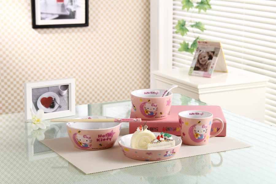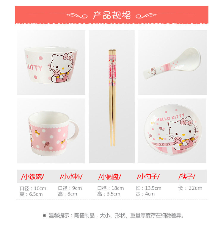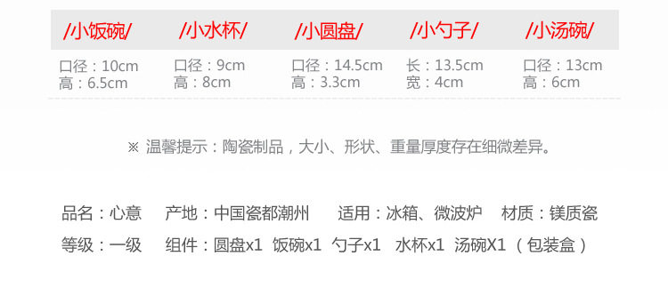 【产品配套】:二个碗、一个碟、一个杯、一只勺、一双筷、装为一套