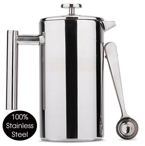 -. Feature : 100% Stainless Steel: The Esperto 34-ounce French press is made from high-grade stainless steel inside and out, making it virtually unbreakable. No Plastic! / 3 Micro Screen Filters: Innovative micro-fine screen filters keep your coffee grounds-free. The fine steel mesh disc seals edges to keep grounds at the bottom. / Dishwasher Safe: Easy to keep French coffee press clean and shiny and your coffee delicious. / Keeps Coffee Hot for 2 Hours: With extra thick double wall insulation, this press pot will keep coffee hot for 2 hours while at home, camping or traveling. / 3 Bonus Gifts: Each stainless steel coffee press comes with (1) stainless steel coffee measuring scoop with bag clip (2) extra micro-fine filter screen and (3) a helpful recipe guide and instruction booklet.