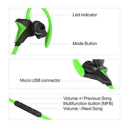 Feature : SWEAT IN STYLE: The winner in sports audio features innovative sweat proof covering and flexible ear hooks that stay in place no matter the physical activity / TOP QUALITY AUDIO: Hear richer and more natural sound from your smartphones, tablets, and audio devices / BLUETOOTH 4.1: The Latest Bluetooth 4.1 technology offers a faster, more energy efficient connection so you can listen to music for up to 4 hours. / CRYSTAL CLEAR COMMUNICATION: Featuring CVC Noise Cancellation technology, the integrated microphone lets you chat without external noise or other interference / ABSOLUTE WIRELESS STABILITY: Built-in ceramic antenna provides enhanced audio quality and more stable Bluetooth pairing, meaning minimal lost connections