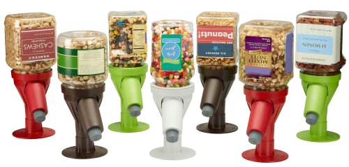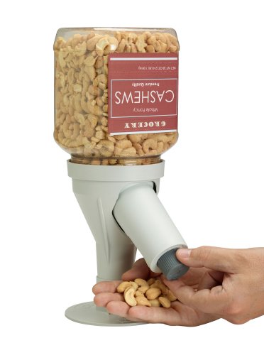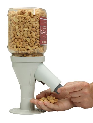 The Snack Spout turns large-size snack nut, jelly bean, and food storage jars, that are found in almost all large U.S. grocery stores (and on Amazon: Signature Cashews 40 Ounce, Signature Milk Chocolate Almonds 48 Ounce, Signature Kirkland Fancy Mixed Nuts 40 Ounce, and dozens more!), into the perfect snack nut, small candy, or cereal dispenser. Instead of screwing back on the jar's lid, you screw on the Snack Spout! With a quick turn of the knob, the Snack Spout dispenses controlled portions directly into your hand or a bowl. Portion plug is removable so you can use with larger nuts or cereals; user-controlled dispensing! This first-to-market design is sturdy, sanitary, and dispenses effortlessly. Unlike other dispensers, the Snack Spout can dispense cashews, almonds, nut mixes, chocolate covered raisins, and of course peanuts and jelly beans! Great for home, in the break room, on the patio, and everywhere else easy, convenient, and sanitary snacking is desired. Works with and fits all large-size snack nut, jelly bean, and plastic food storage jars with 89mm or 110mm mouth opening. Food items and jars sold separately. Find the jars at Costco, Walmart, Target, Safeway, Kroger, Sams Club, and many, many more!