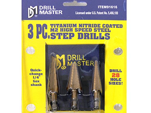 Titanium Nitride Coated High Speed Steel Step Drills 3 Piece Set with Velcro Pouch