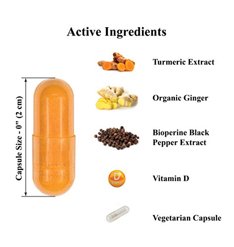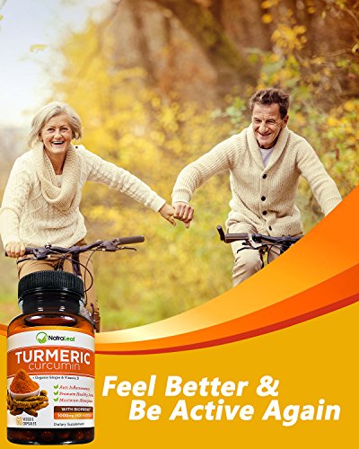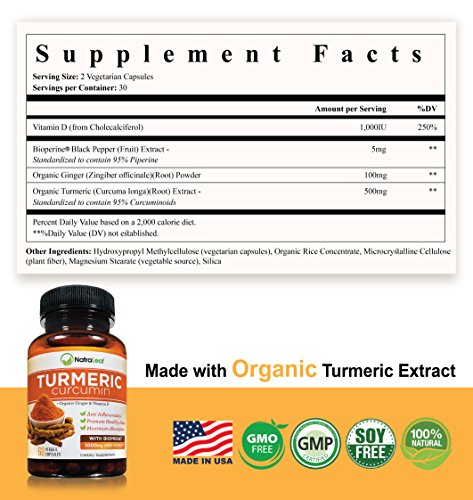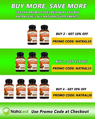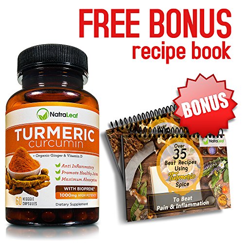-. Feature : ✓Joint Pain Relief & Promotes Mobility - NatraLeaf Turmeric Curcumin gives you the power to help reduce inflammation and joint pain ..the "natural way" and get back to a healthy & active lifestyle. Formulated as a powerful antioxidant & anti-inflammatory turmeric supplement. With non-GMO & organic ingredients, you will feel confident that you are giving your body the best. / ✓With 3 Key Ingredients "Feel Better & Be Active Again!" - Specially formulated w/ three powerful ingredients - Turmeric Extract - Vitamin D - Organic Ginger. Daily serving (2 capsules) formula has 500mg of turmeric extract with 95% Standardized Curcumoids & 5mg of black pepper extract, 1000IU of Vitamin D for Strong Bones, & 100mg organic ginger for increased absorption & healthy GI Tract. 60 easy-to- swallow veggie capsules. / ✓TODAY'S COUPON OFFER! Buy 1 and get 15% Off...Use code NATRA015 at checkout (must state "Sold by NatraLeaf" for code to work. Hassle Free Return - Buy with confidence & risk free! Get the relief you need or your money back! / ✓High Quality Turmeric Capsules Enriched w/ Bioperine - Patented & extracted from black pepper, turmeric with bioperine plays a major role in the RAPID ABSORPTION and potency of curcumin! With 5mg of BioPerine (turmeric with black pepper), this high-end turmeric curcumin formula makes a SAFE, POTENT, HIGHLY EFFICIENT supplement for men and women of all ages. / ✓A Curcumin Supplement You Can Trust | 3rd Party Independent Tested for Purity, Potency & Your Safety| No Artificial Ingredients| Natural & Organic | Made in USA | Formulated in a FDA Inspected & Certified GMP Facility (Good Manufacturing Practices) adhering to strict agency guidelines| Free Turmeric Recipe emailed to you w/ over 35 recipes Included!