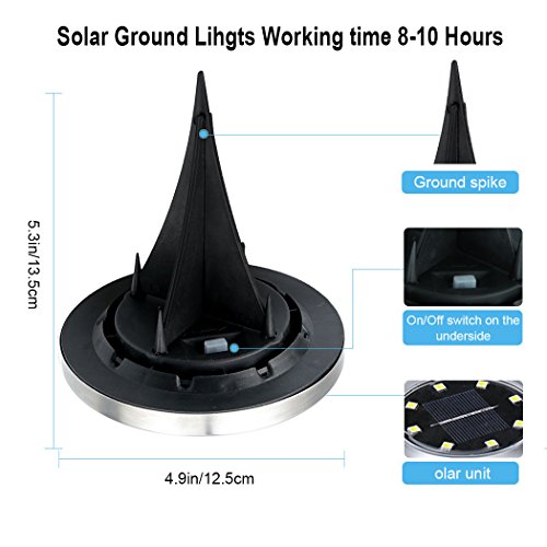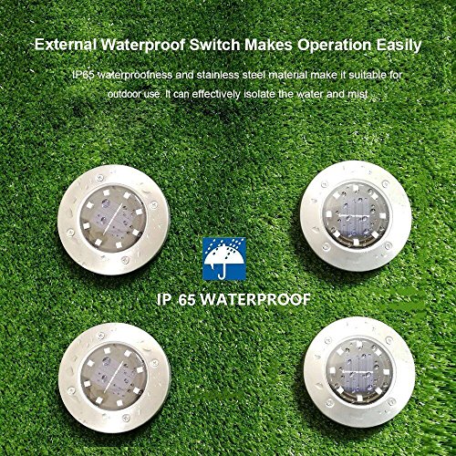 - 【PROTECTION DESIGN】External waterproof switch, instead of pinhole switch, makes operation easily, IP65 waterproofness and stainless steel material make it suitable for outdoor use. It can effectively isolate the water and mist.The solar ground lights can work under kinds of weather, like rain, snow, frost, or sleet.