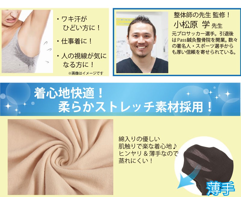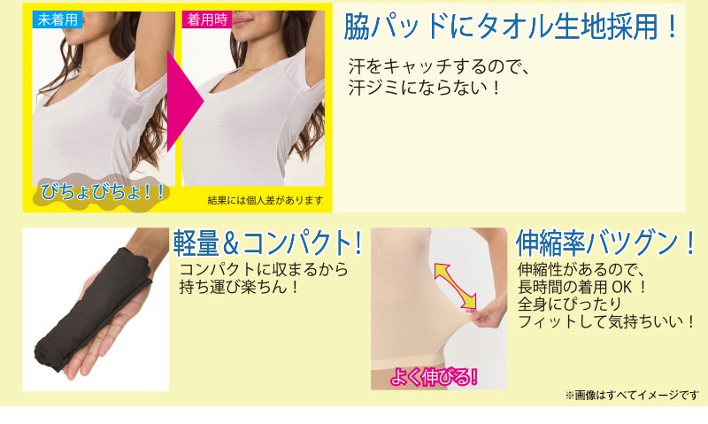 | 商品説明 | もう汗ジミ気にしない!インナーなのでサラリと着るだけ。 タオル地のパッドがワキ汗をぐんぐんキャッチ! |