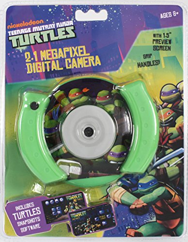 This Teenage Mutant Ninja Turtles 2.1MP Camera also includes a USB Cable, CD-Rom Software, and User Manual! Takes up to 120 digital photos! The camera features a 1.5" Preview Screen so you can see all of your awesome pictures you take! The USB cable allows for a quick and easy download. It is easy to use and comfortable with it's spongy-soft rubber handles. Colors: Green and black, also has a pictures of the Teenage Ninja Mutant Turtles. Also includes snapshots software! You can write your own story...awesome stickers and frames! So easy to organize your photos and comes with 5 games and other built-in activity applications! Made for ages 8+!Feature