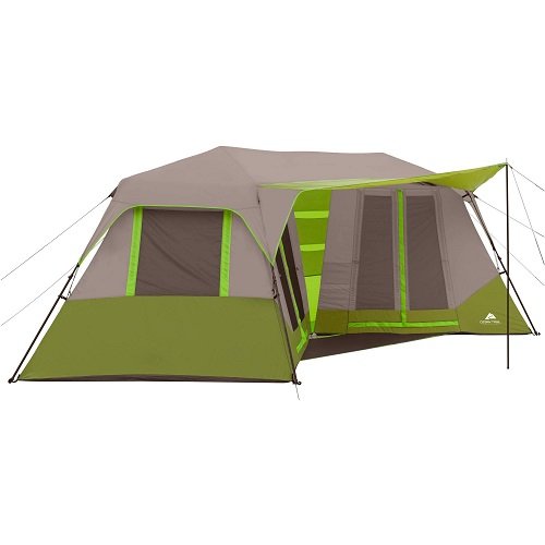 Studio : Ozark Trail Publisher : Ozark Trail Product Description Sets up in under 2 minutes No assembly required; poles pre-attached to tent Sleeps 8 Fits 2 queen airbeds Double cabin footprint connected by large gear organizer Each cabin sleeps 4 campers Covered front and back porch space with large gear organizer 10 large windows and mesh panel ceilings for amazing views and great ventilation Front and back doors on each cabin for easy tent access Includes rainfly with factory sealed seams 2 electrical cord access points Large gear organizer included Carry bag included Tent stakes included Measures 23' x 11'6" Height: 76" Construction: polyester, steel 0