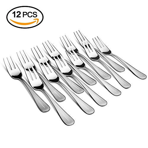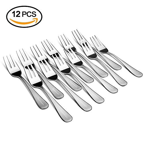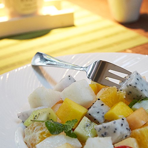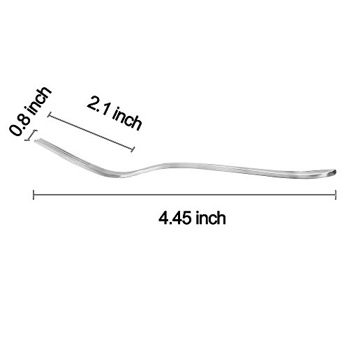 Curve lines with uncomplicated styling, simple but stylish design, allows for mix and match with your existing flatware in your kitchen, so you may be able to prevent having to replace lost forks. Heavy duty, durable and no burrs, dishwasher-safe without harsh detergents, made from extra-fine 18/10 stainless steel with extra thick ergonomics handle Modern and functional, the comfortable size and weight of these dinner forks makes them perfect for use in restaurants and bars that offer good quality desserts, you can also use them to eat salad, fruit and cakes. If you're not completely satisfied with our forks, please let us know and we will offer a optimal solution to you as soon as possible. Dimension: 5.4 x 0.83 x 0.82 inches. Package: mirror finish stainless steel dinner fork x 12 0