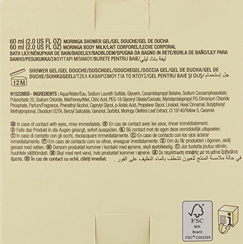 Contains: Shower Gel Moringa, 2 Fl Oz. Body Milk Moringa, 2 Fl Oz. Bath Lily, Cream.