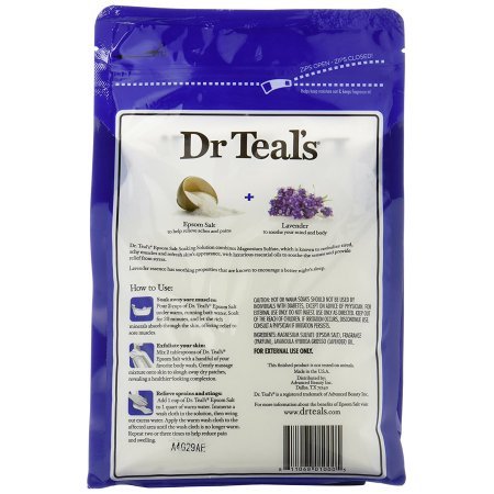 Studio : Dr. Teal's Publisher : Dr. Teal's Binding : Misc. Product Description Zips Open--Zips Closed!; Helps Keep Moisture Out Keeps Fragrance In! Epsom Salt to help relieve aches and pains lavender to soothe your mind and body. Dr. Teal's Epsom Salt Soaking Solution, Soothe Sleep, 48 Oz 0