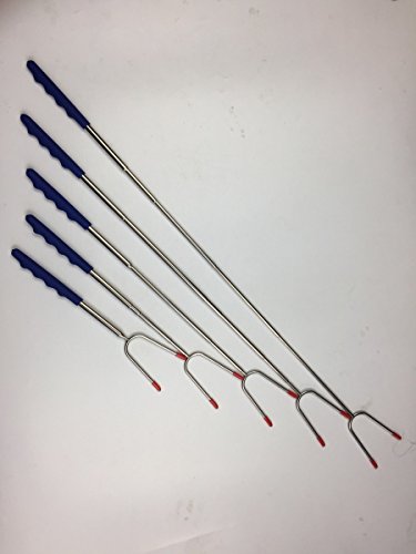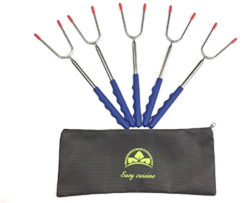 Easy Cuisine marshmallow roasting sticks/skewers/forks (set of 5), extendable 45 inch, extra long, smores, hot dog, grilling, BBQ, fire pit, camping, campfire, patio. safe rubber handles, free bag.