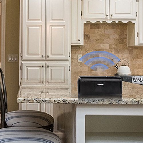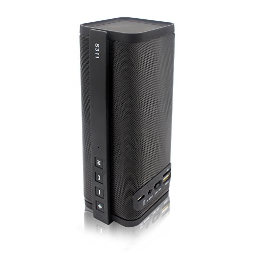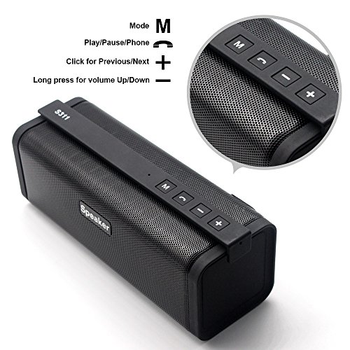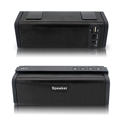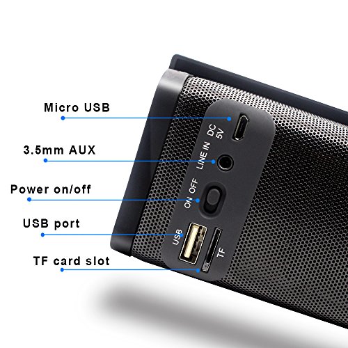 -. Feature : The 1200mAh built-in battery can be a power bank for emergent charging and plays about 6 to 10 hours depending on volume. And FM Radio also supported / Two 5w speakers provide a nice subwoofer sound & built-in Microphone supports phone call and audio chat / Two anti-skid gaskets at the bottom preventing the speaker from sliding, shock proof / Come with four ports available in USB, micro USB, 3.5mm AUX and TF card slot / Clear & well organized physical buttons for Power, Modes, Volume/Songs up and down, play/stop/phone call