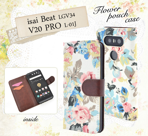 isai Beat LGV34/V20 PRO L-01J用のエレガントなフラワーポーチケース。