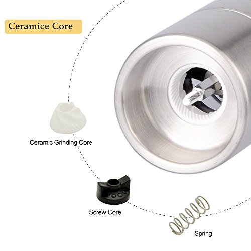 - DURABLE GRINGING CORE: Compared to metal grinding core, Ceramic grinding core is much more corrosion resistant and abrasion resistant. The durable ceramic core will never rust or dull. It is suitable for both conventional whole salt and peppercorns.